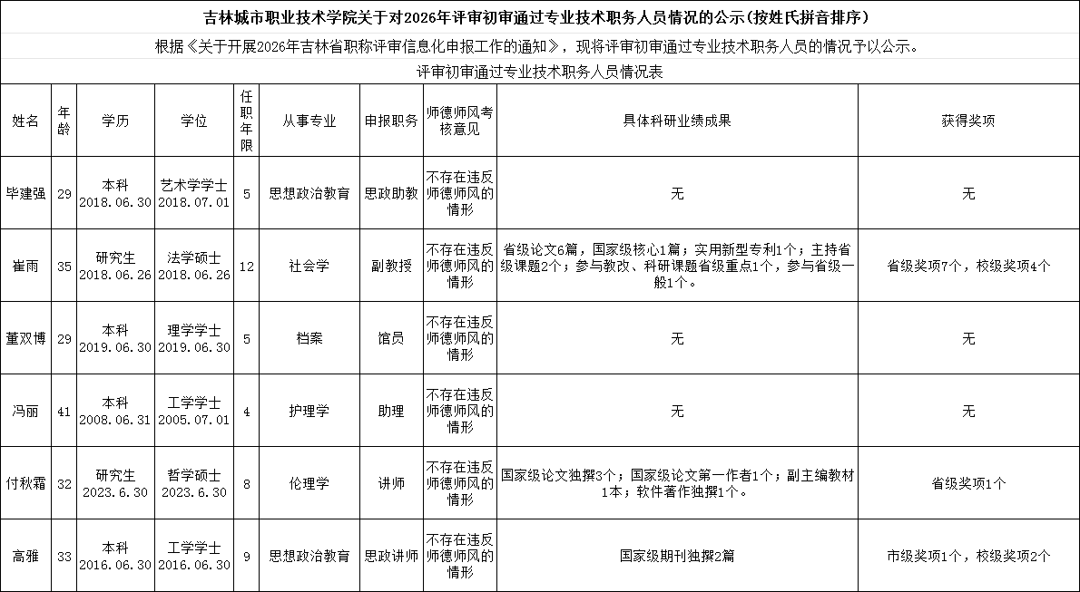 吉林城市职业技术学院关于对2026年初审通过专业技术职务人员情况的公示